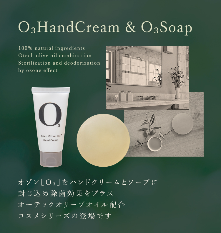 オーテック・オリーブオイルはオゾンの除菌効果・消臭効果はそのままに本来ならすぐに反応し分解消失する特性を長期保存できるメリットがあります。最高級オリーブオイルにオゾンを独自製法で配合したオーテック・オリーブオイルをふんだんに使用したハンドクリームとソープを是非お試しください。
